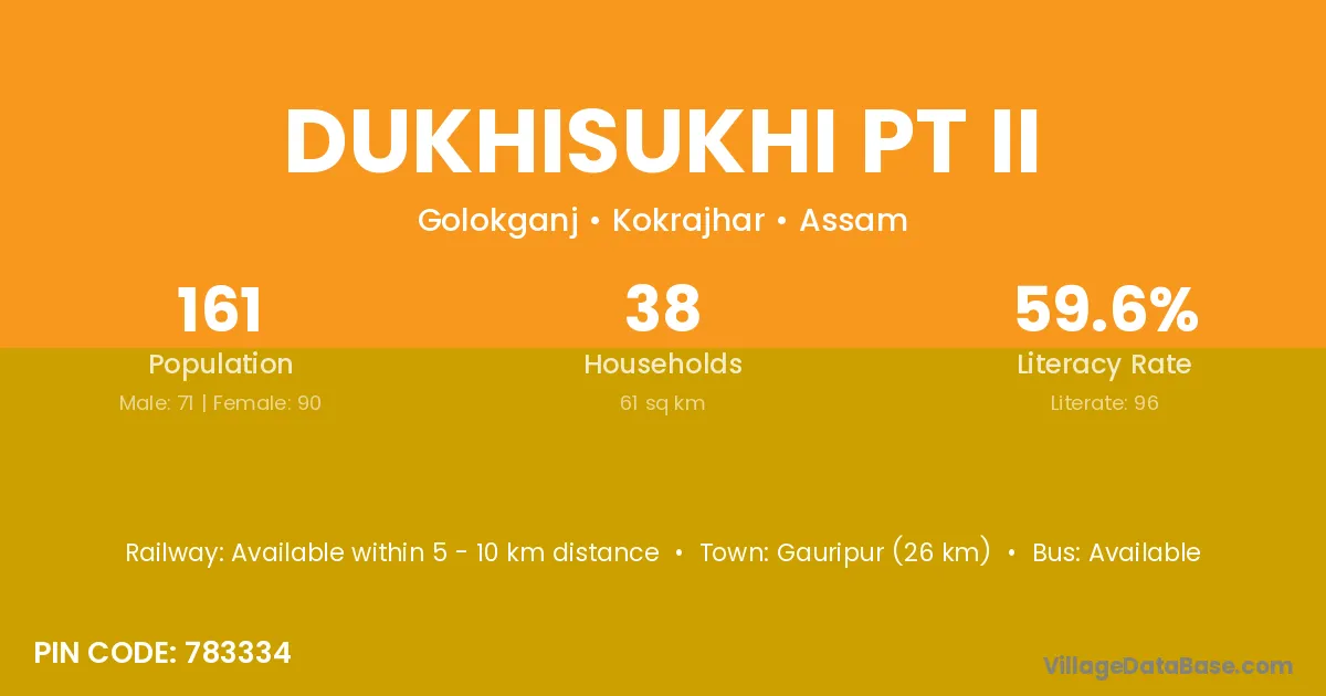 Gauripur (26 km) is the nearest town to Dukhisukhi Pt Ii village for major economic activities and is located approximately 26 km away.