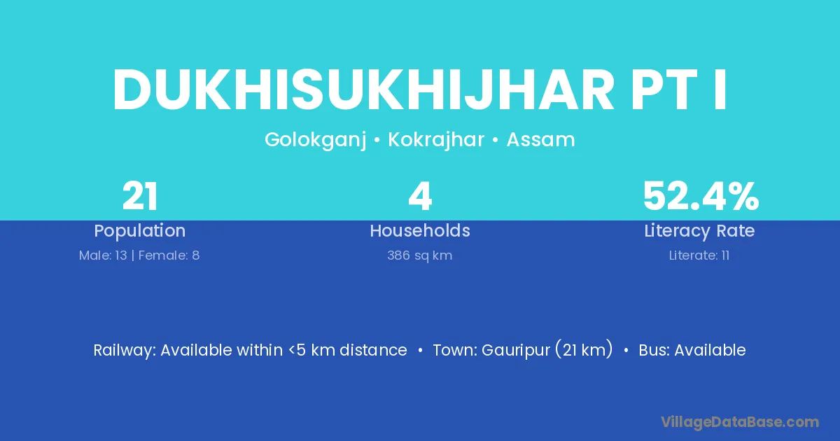 Dukhisukhijhar Pt I village has a total population of 21 people, of which 13 are males and 8 are females.