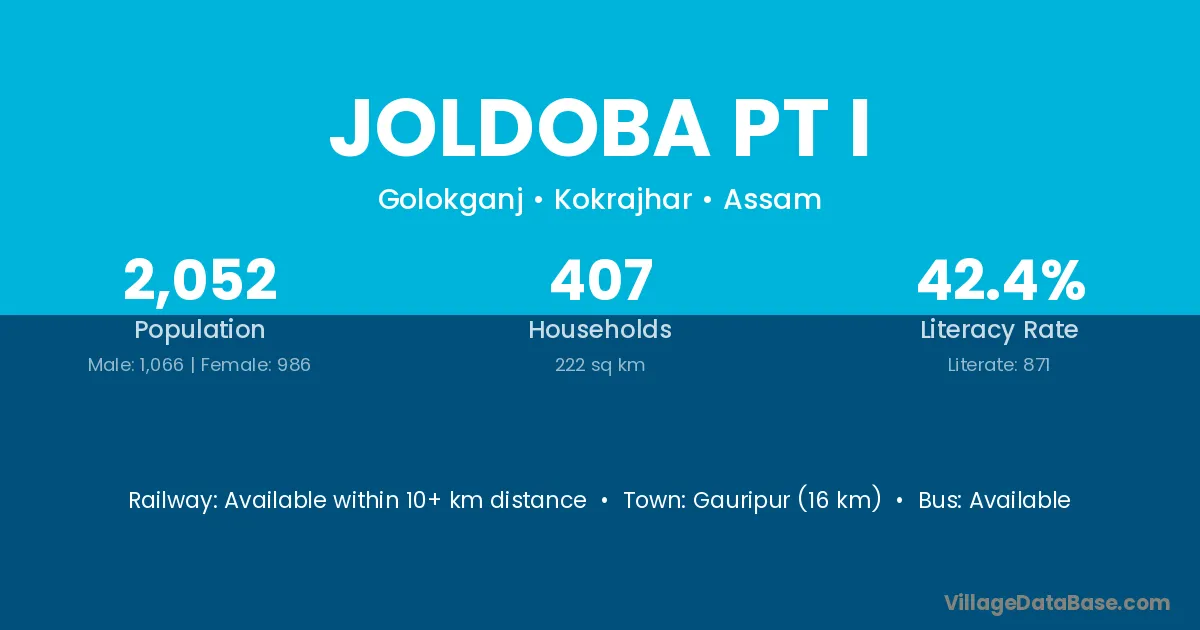 Gauripur (16 km) is the nearest town to Joldoba Pt I village for major economic activities and is located approximately 16 km away.