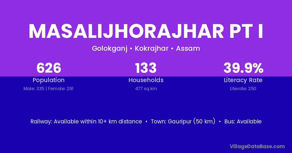 Gauripur (50 km) is the nearest town to Masalijhorajhar Pt I village for major economic activities and is located approximately 50 km away.