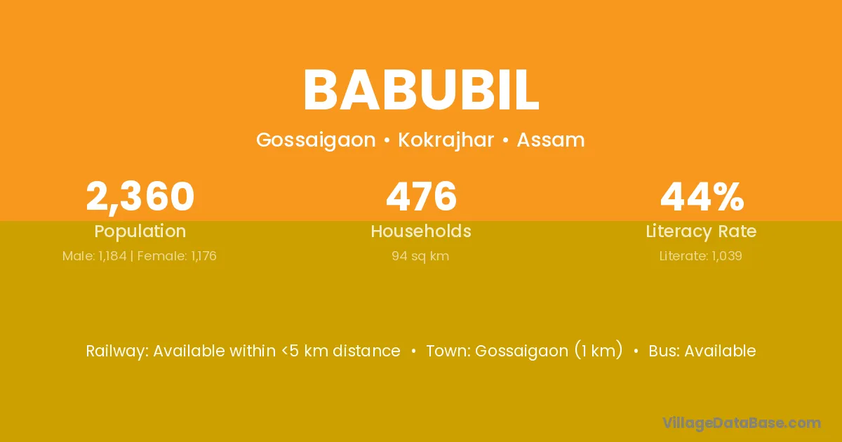 Gossaigaon (1 km) is the nearest town to Babubil village for major economic activities and is located approximately 1 km away.