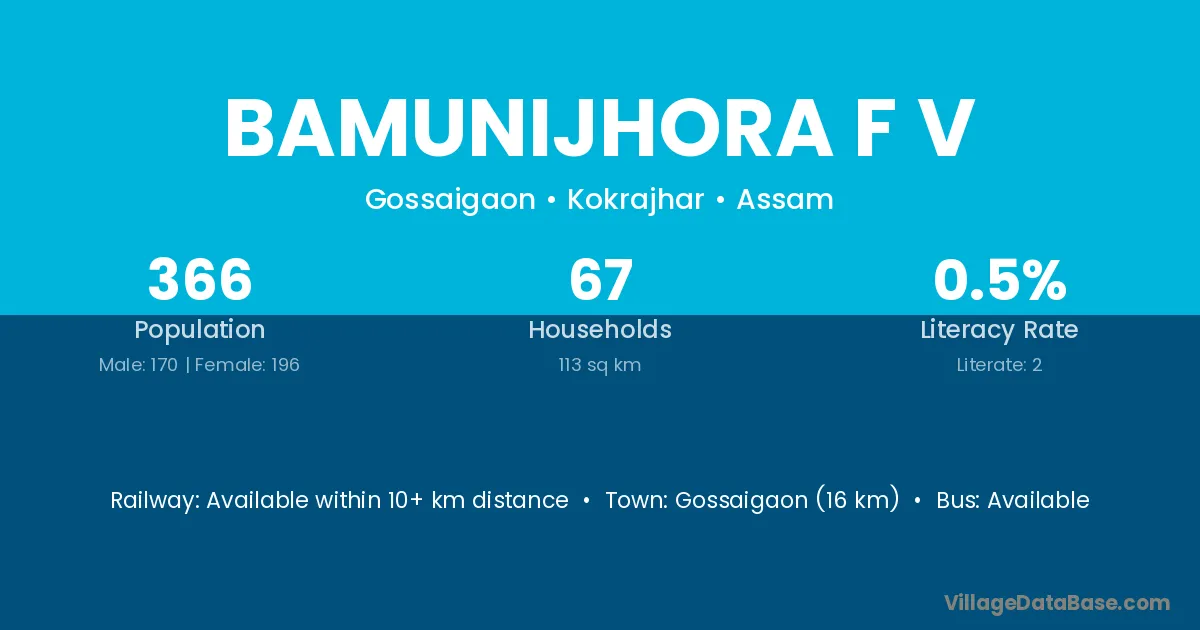Gossaigaon (16 km) is the nearest town to Bamunijhora F V village for major economic activities and is located approximately 16 km away.