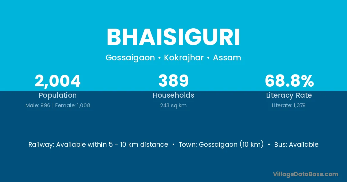Gossaigaon (10 km) is the nearest town to Bhaisiguri village for major economic activities and is located approximately 10 km away.