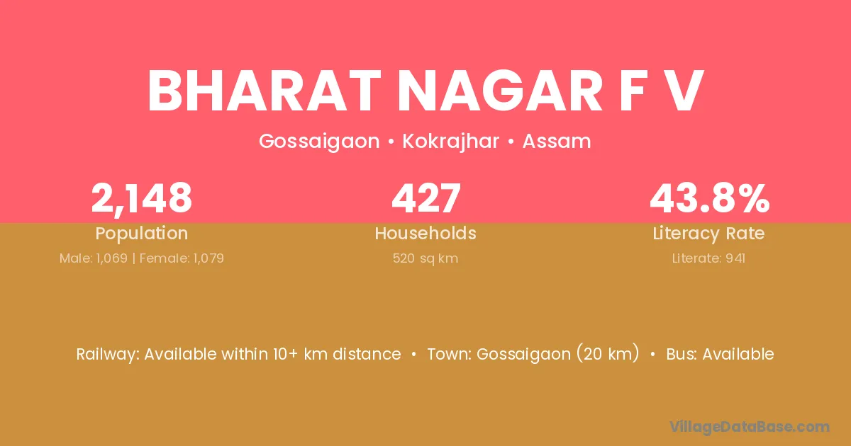Gossaigaon (20 km) is the nearest town to Bharat Nagar F V village for major economic activities and is located approximately 20 km away.