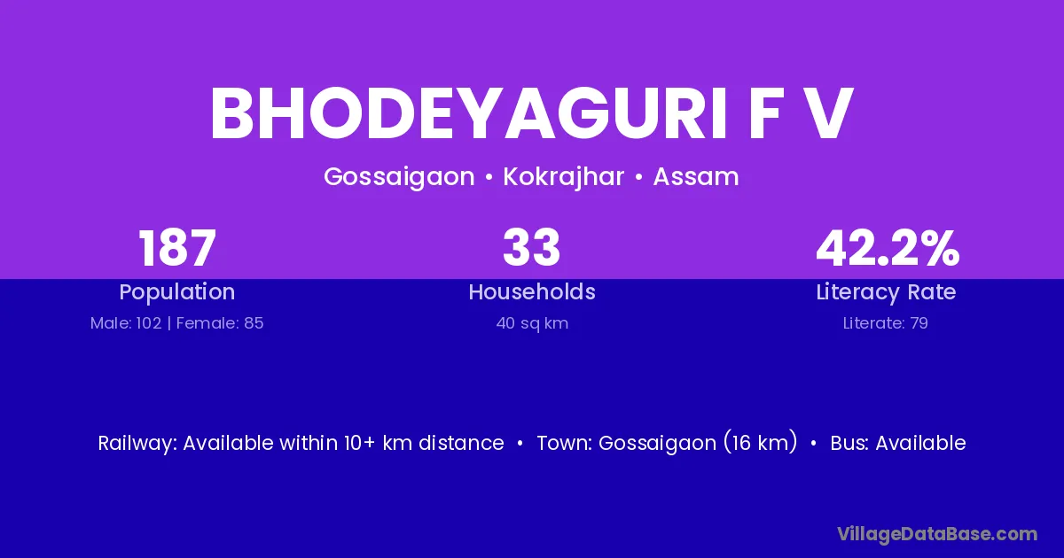 Gossaigaon (16 km) is the nearest town to Bhodeyaguri F V village for major economic activities and is located approximately 16 km away.
