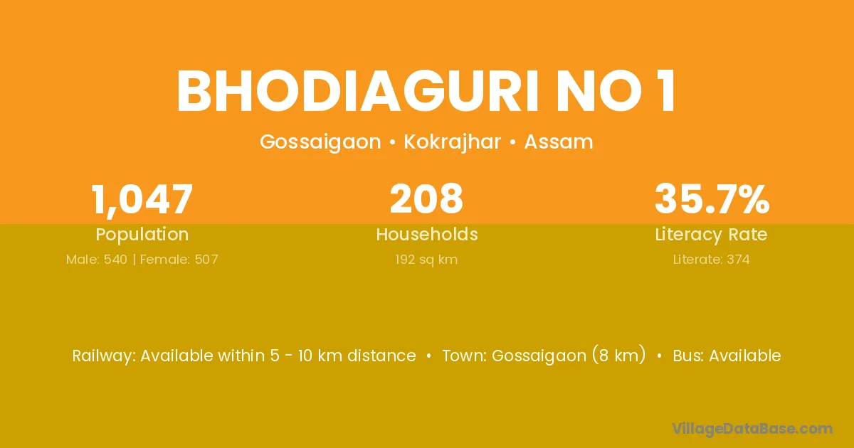 Gossaigaon (8 km) is the nearest town to Bhodiaguri No 1 village for major economic activities and is located approximately 8 km away.