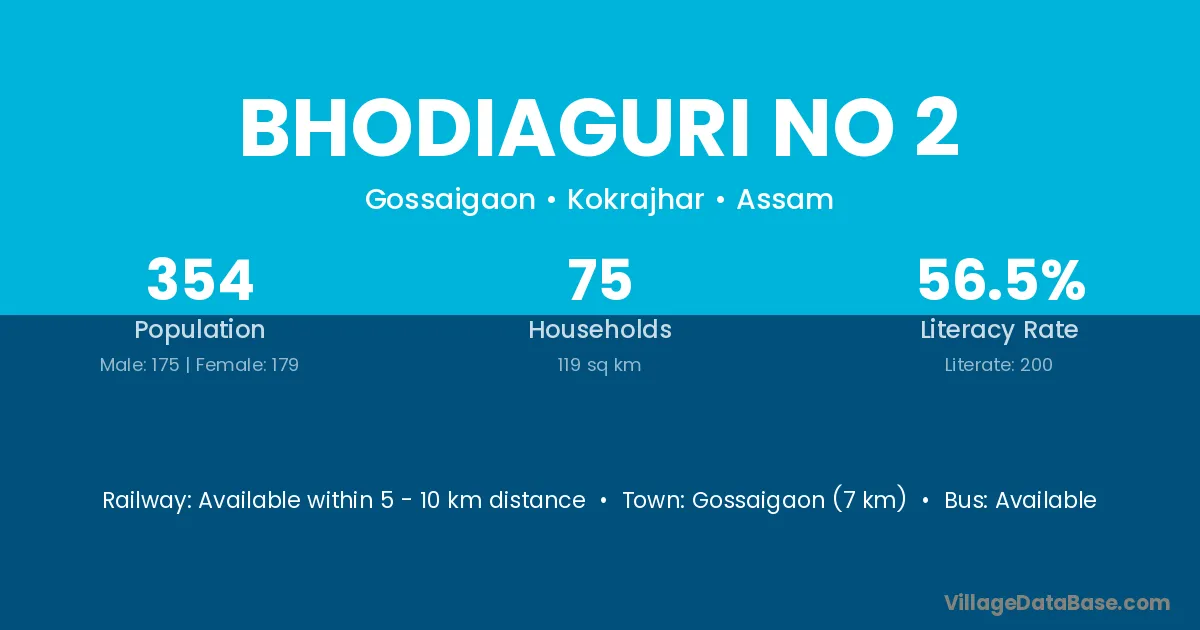Bhodiaguri No 2 village has a total population of 354 people, of which 175 are males and 179 are females.