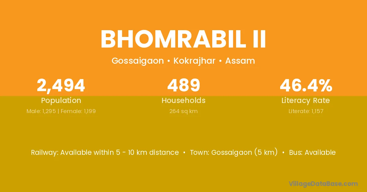 Gossaigaon (5 km) is the nearest town to Bhomrabil Ii village for major economic activities and is located approximately 5 km away.