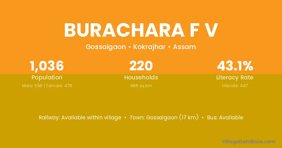 Gossaigaon (17 km) is the nearest town to Burachara F V village for major economic activities and is located approximately 17 km away.