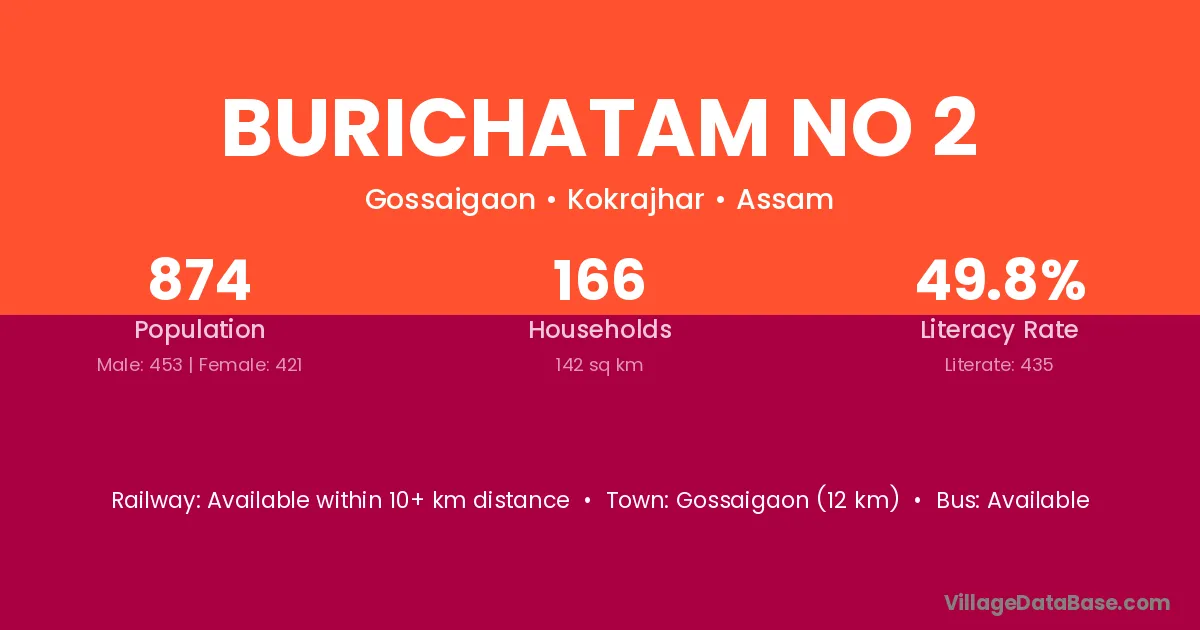 Gossaigaon (12 km) is the nearest town to Burichatam No 2 village for major economic activities and is located approximately 12 km away.