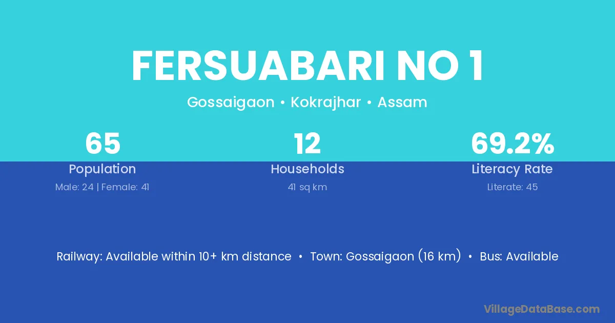 Fersuabari No 1 village has a total population of 65 people, of which 24 are males and 41 are females.