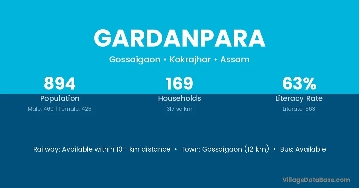 Gossaigaon (12 km) is the nearest town to Gardanpara village for major economic activities and is located approximately 12 km away.