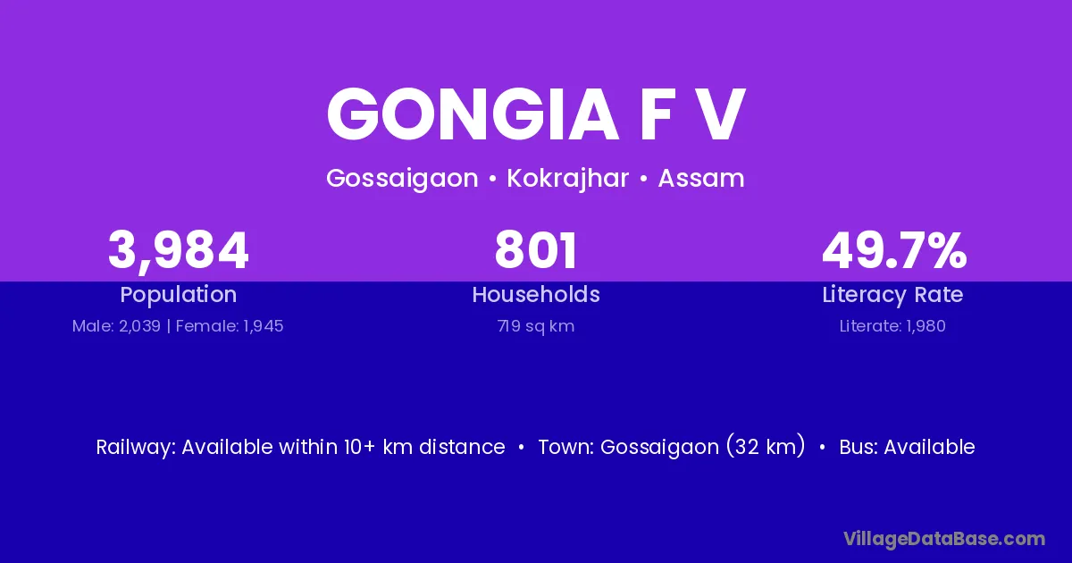 Gossaigaon (32 km) is the nearest town to Gongia F V village for major economic activities and is located approximately 32 km away.