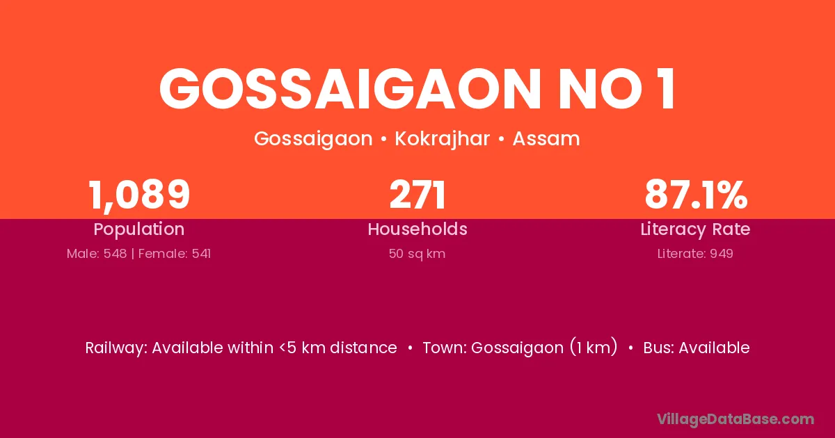 Gossaigaon No 1 village has a total population of 1,089 people, of which 548 are males and 541 are females.