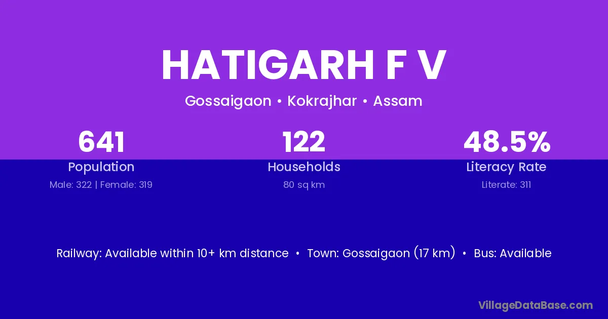 Gossaigaon (17 km) is the nearest town to Hatigarh F V village for major economic activities and is located approximately 17 km away.