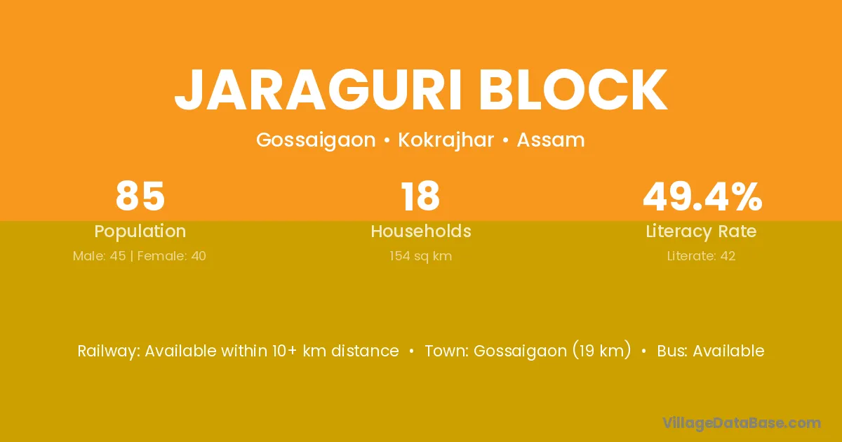 Gossaigaon (19 km) is the nearest town to Jaraguri Block village for major economic activities and is located approximately 19 km away.