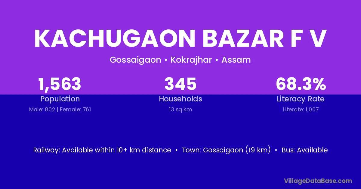 Gossaigaon (19 km) is the nearest town to Kachugaon Bazar F V village for major economic activities and is located approximately 19 km away.