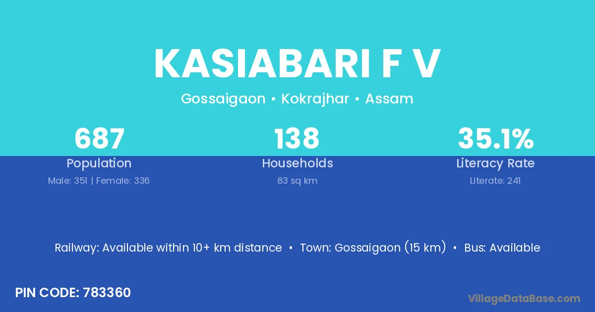 Gossaigaon (15 km) is the nearest town to Kasiabari F V village for major economic activities and is located approximately 15 km away.