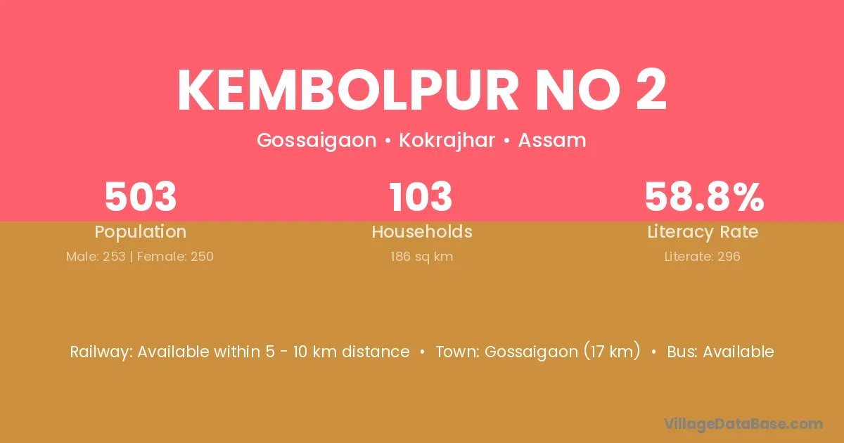 Kembolpur No 2 village has a total population of 503 people, of which 253 are males and 250 are females.