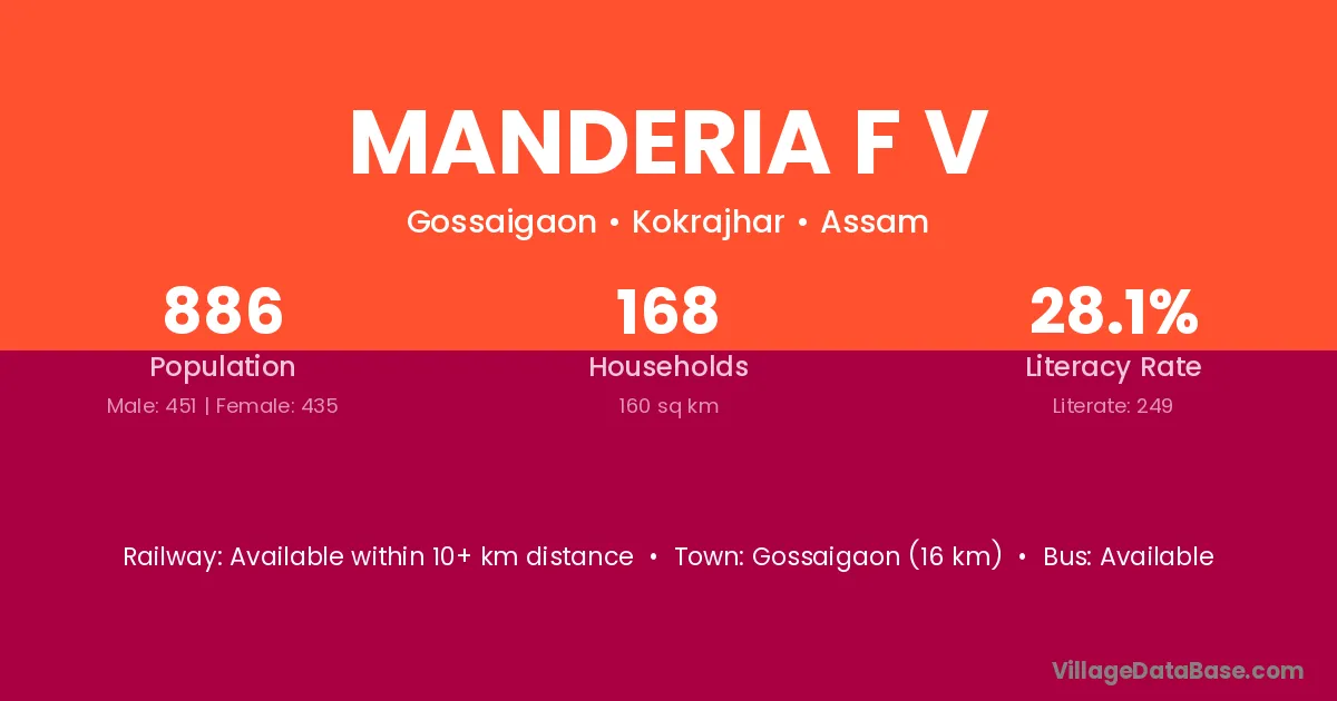 Gossaigaon (16 km) is the nearest town to Manderia F V village for major economic activities and is located approximately 16 km away.