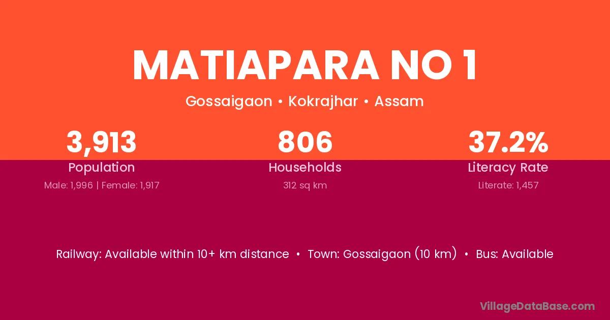Gossaigaon (10 km) is the nearest town to Matiapara No 1 village for major economic activities and is located approximately 10 km away.