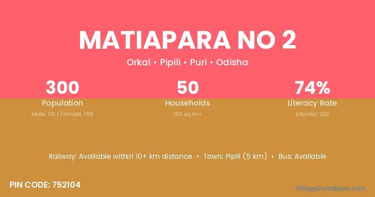 Matiapara No 2 village has a total population of 1,289 people, of which 682 are males and 607 are females.