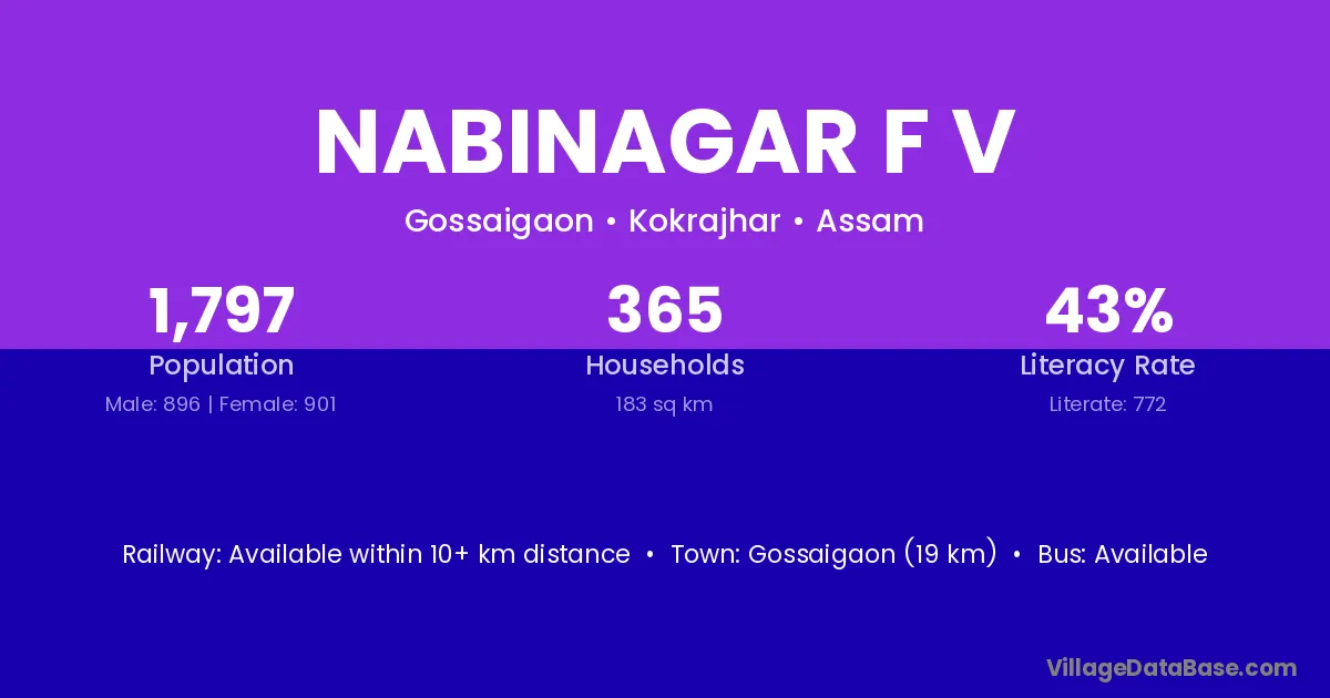 Gossaigaon (19 km) is the nearest town to Nabinagar F V village for major economic activities and is located approximately 19 km away.