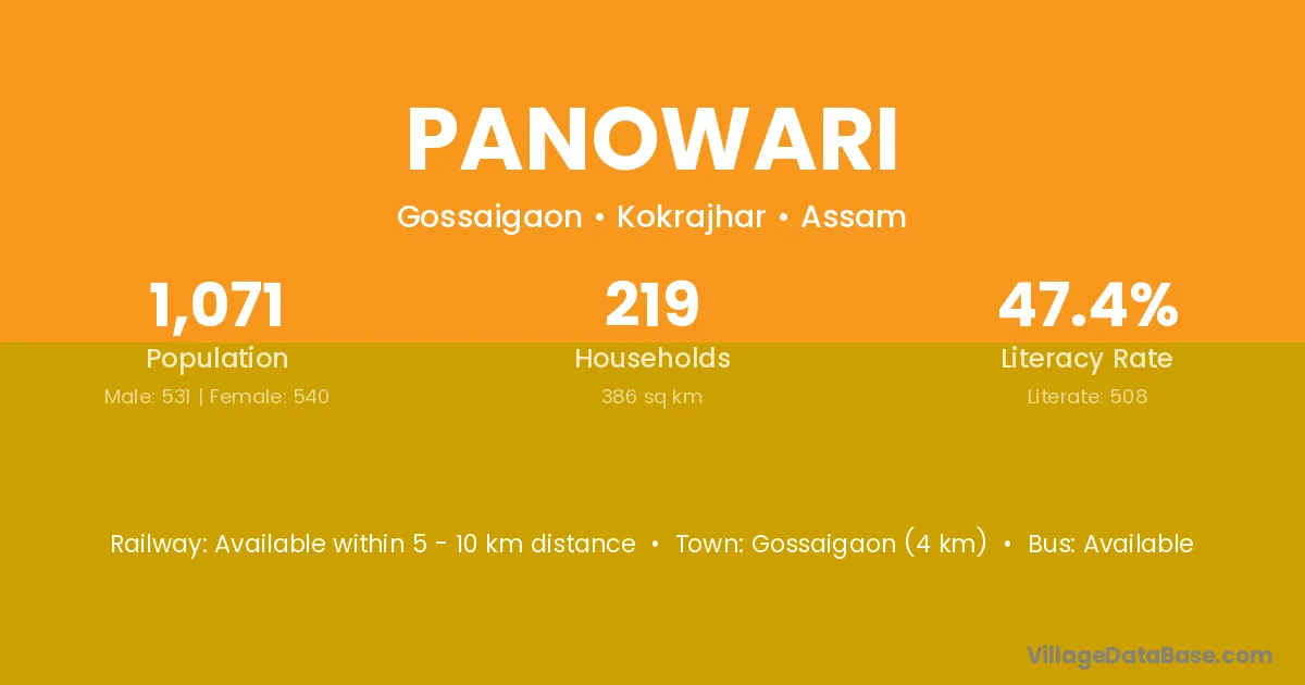 Gossaigaon (4 km) is the nearest town to Panowari village for major economic activities and is located approximately 4 km away.