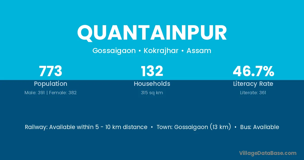 Gossaigaon (13 km) is the nearest town to Quantainpur village for major economic activities and is located approximately 13 km away.