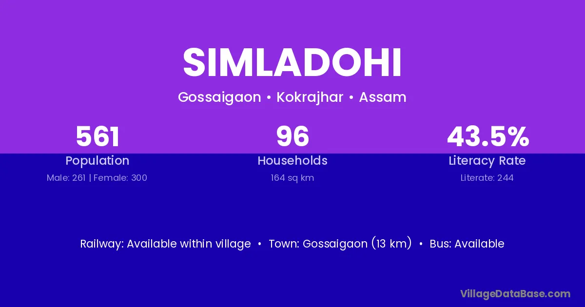 Gossaigaon (13 km) is the nearest town to Simladohi village for major economic activities and is located approximately 13 km away.