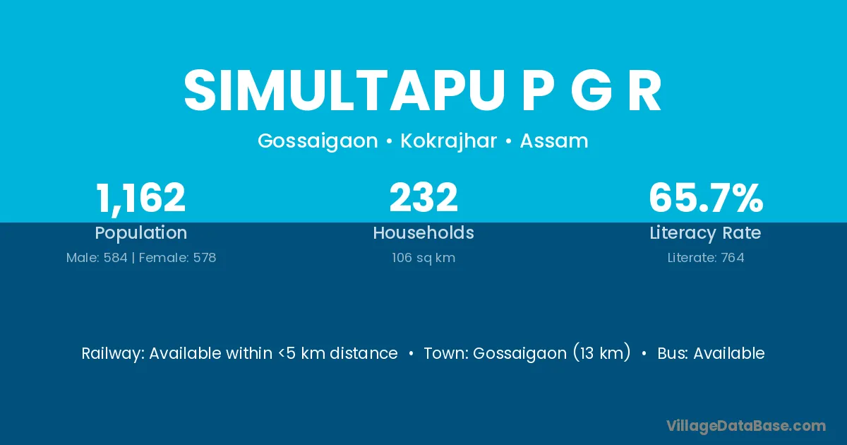 Gossaigaon (13 km) is the nearest town to Simultapu P G R village for major economic activities and is located approximately 13 km away.