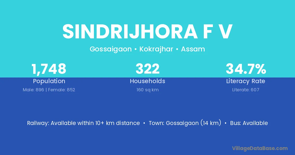 Gossaigaon (14 km) is the nearest town to Sindrijhora F V village for major economic activities and is located approximately 14 km away.
