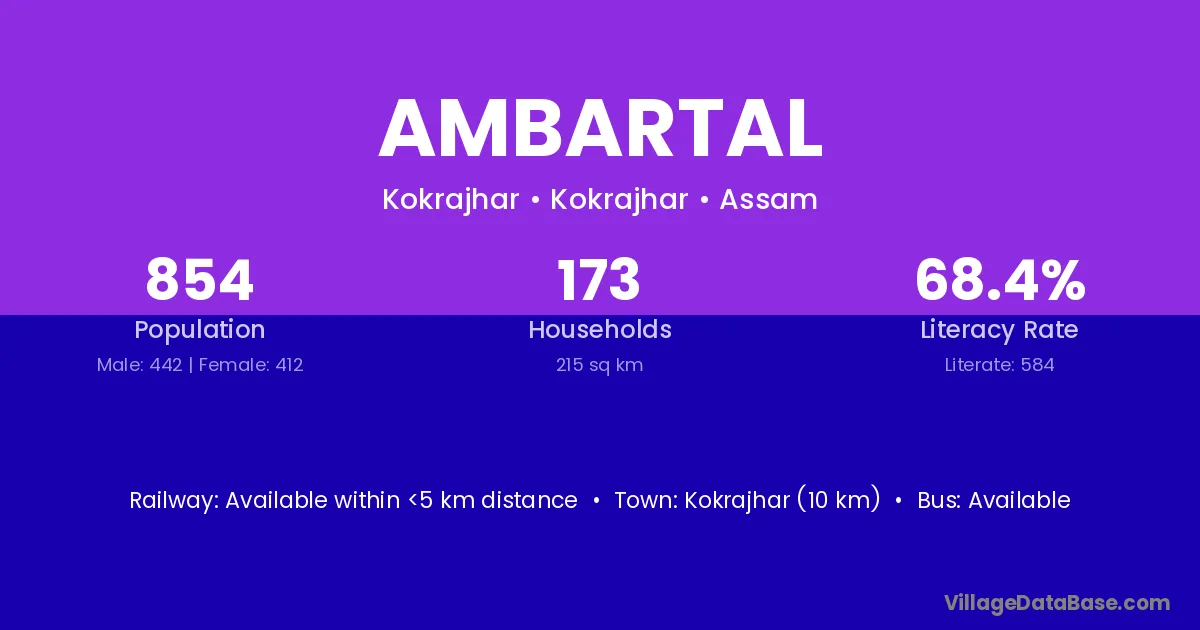 Kokrajhar (10 km) is the nearest town to Ambartal village for major economic activities and is located approximately 10 km away.