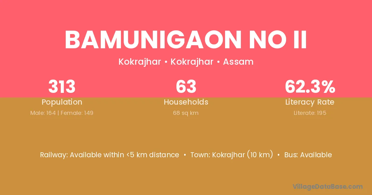 Bamunigaon No Ii village has a total population of 313 people, of which 164 are males and 149 are females.