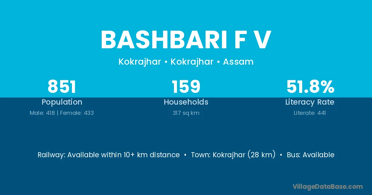 Bashbari F V village has a total population of 851 people, of which 418 are males and 433 are females.