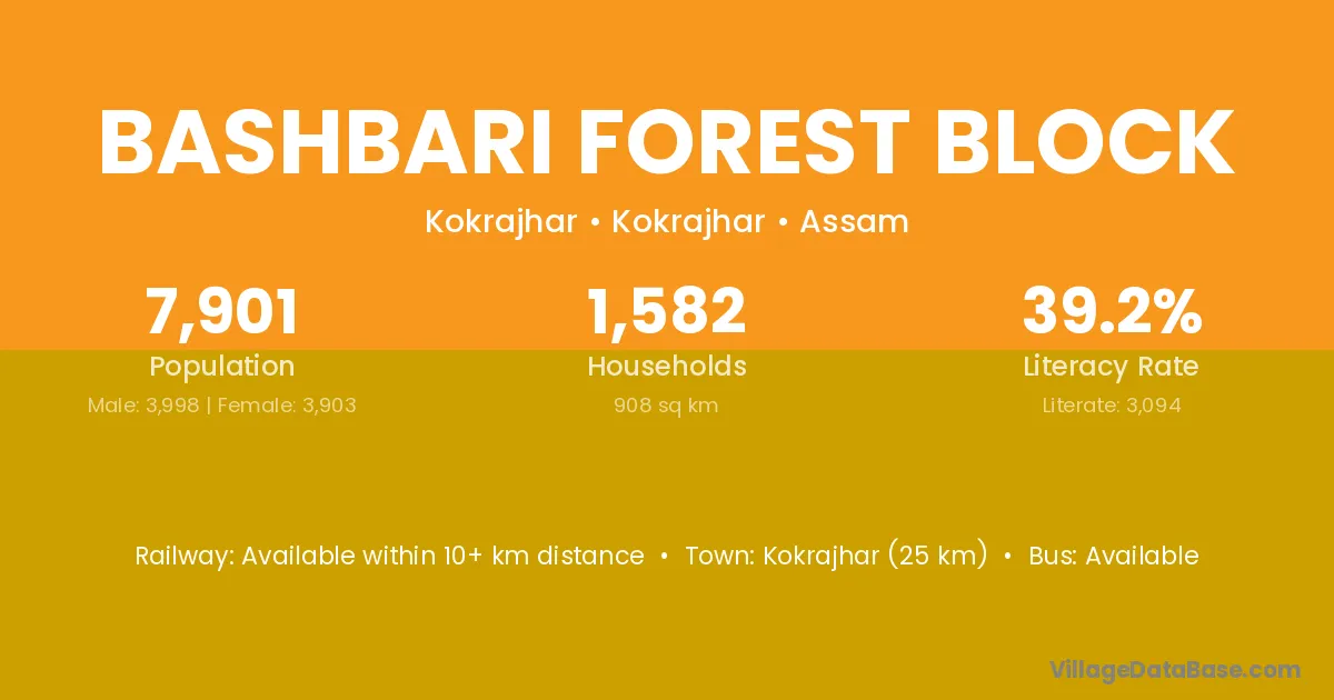 Bashbari Forest Block village has a total population of 7,901 people, of which 3,998 are males and 3,903 are females.