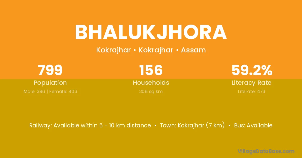 Kokrajhar (7 km) is the nearest town to Bhalukjhora village for major economic activities and is located approximately 7 km away.