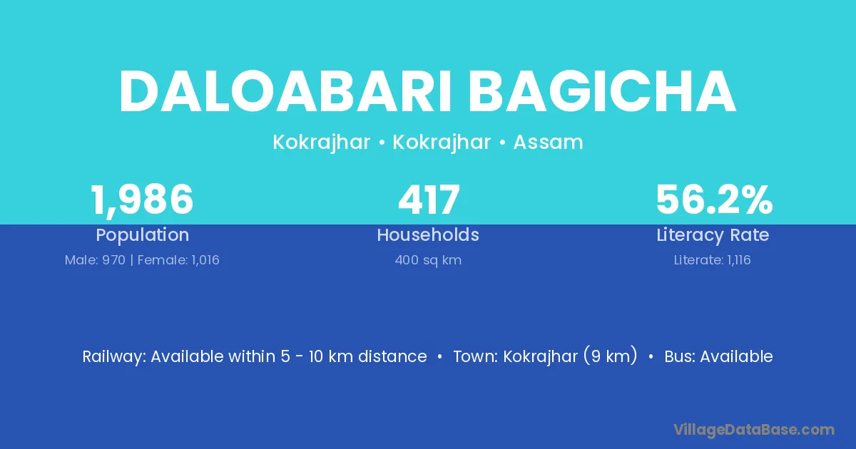Daloabari Bagicha village has a total population of 1,986 people, of which 970 are males and 1,016 are females.