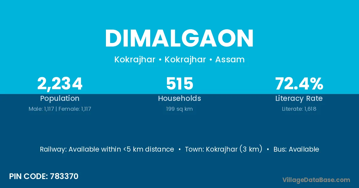 Kokrajhar (3 km) is the nearest town to Dimalgaon village for major economic activities and is located approximately 3 km away.