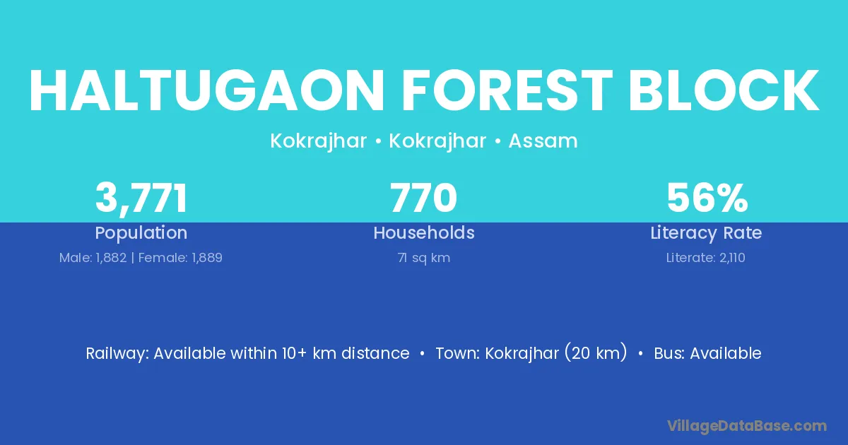 Kokrajhar (20 km) is the nearest town to Haltugaon Forest Block village for major economic activities and is located approximately 20 km away.