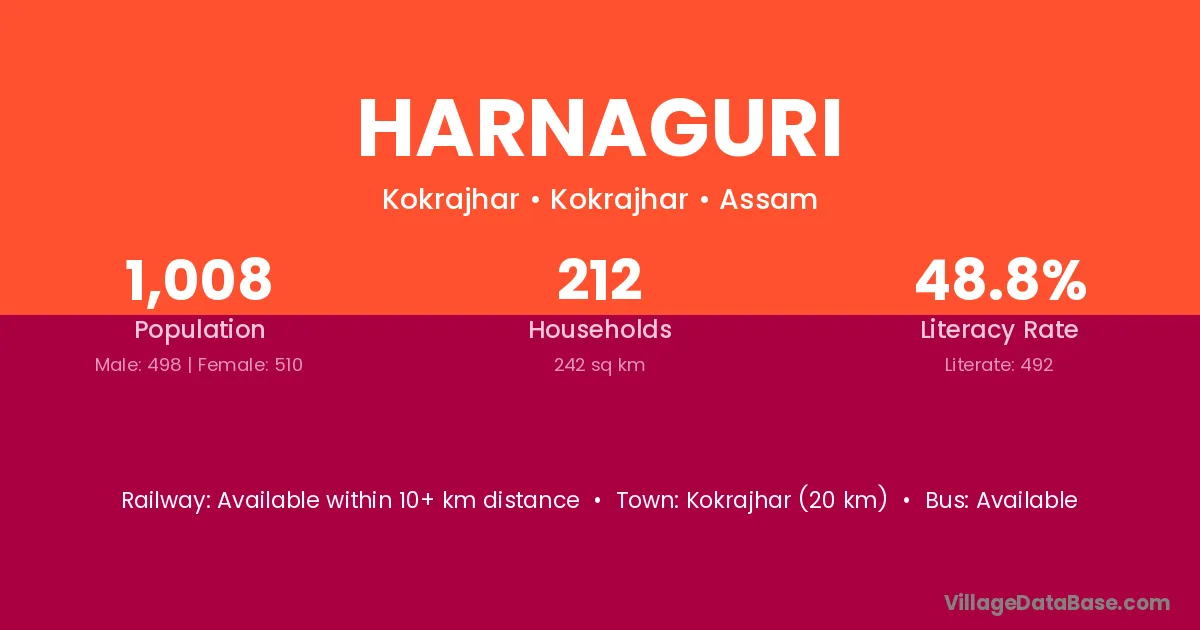 Harnaguri village has a total population of 1,008 people, of which 498 are males and 510 are females.