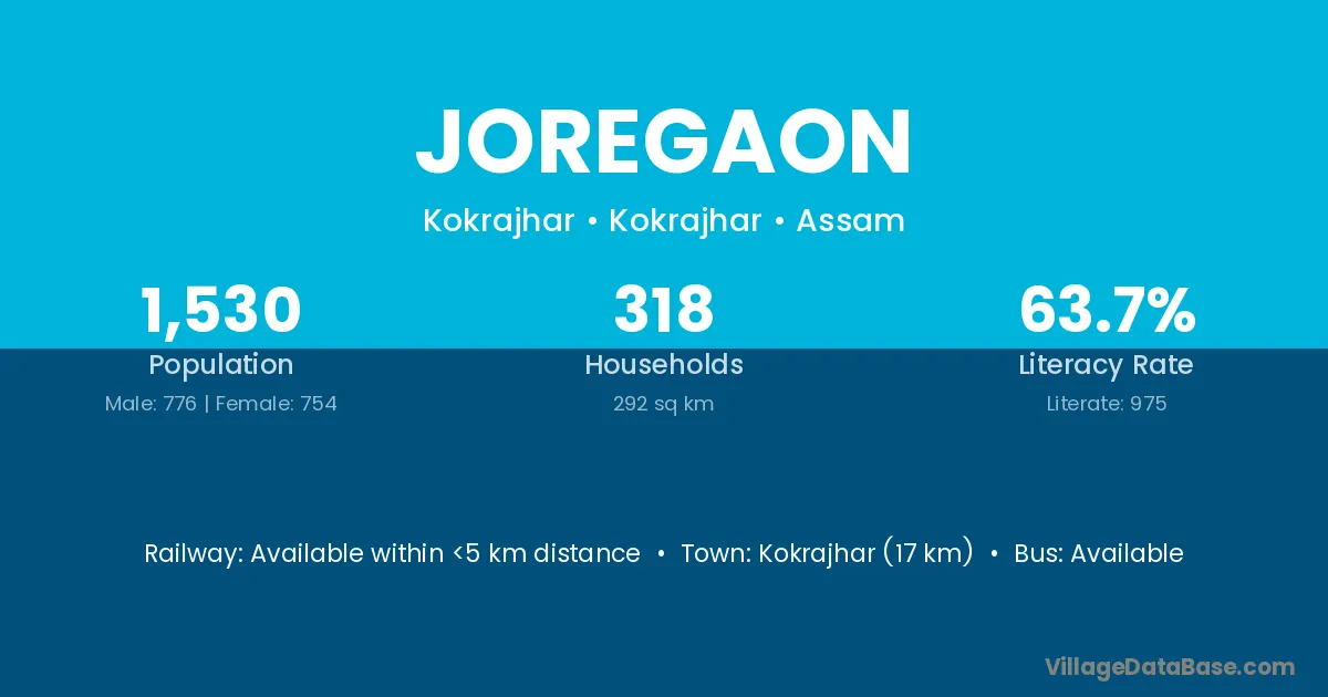Kokrajhar (17 km) is the nearest town to Joregaon village for major economic activities and is located approximately 17 km away.