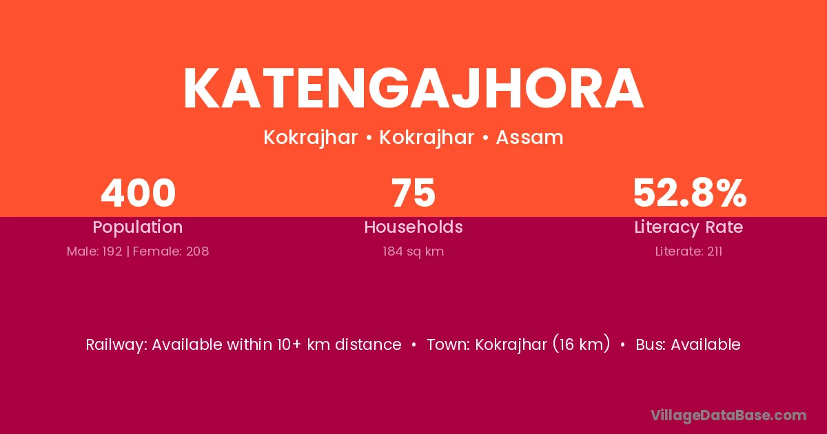 Kokrajhar (16 km) is the nearest town to Katengajhora village for major economic activities and is located approximately 16 km away.