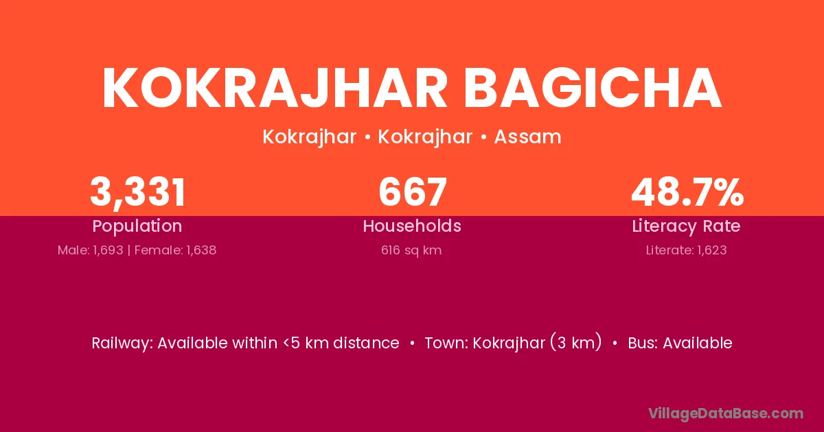 Kokrajhar (3 km) is the nearest town to Kokrajhar Bagicha village for major economic activities and is located approximately 3 km away.