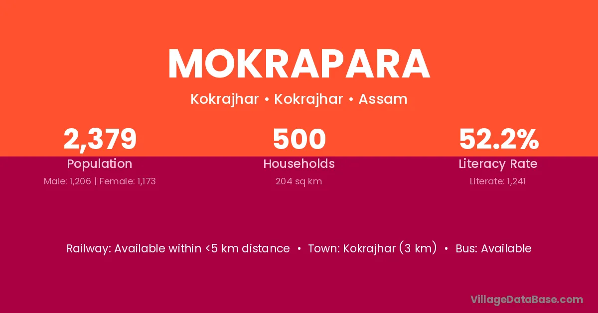 Kokrajhar (3 km) is the nearest town to Mokrapara village for major economic activities and is located approximately 3 km away.