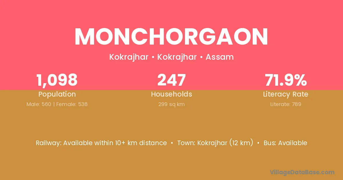 Kokrajhar (12 km) is the nearest town to Monchorgaon village for major economic activities and is located approximately 12 km away.