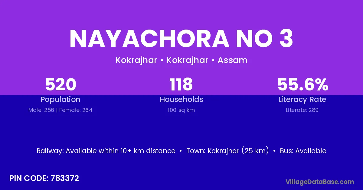 Kokrajhar (25 km) is the nearest town to Nayachora No 3 village for major economic activities and is located approximately 25 km away.