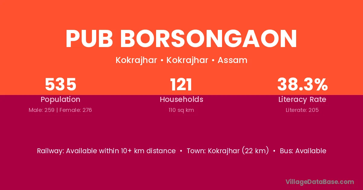 Pub Borsongaon village has a total population of 535 people, of which 259 are males and 276 are females.