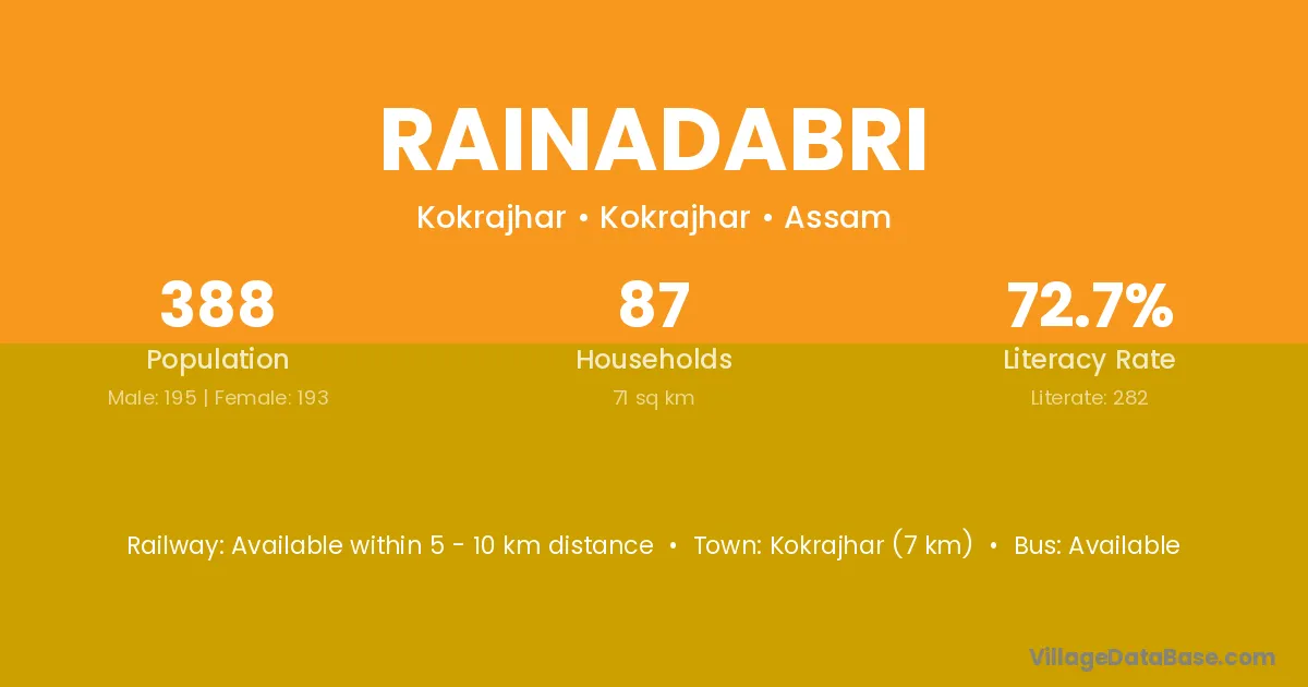 Kokrajhar (7 km) is the nearest town to Rainadabri village for major economic activities and is located approximately 7 km away.