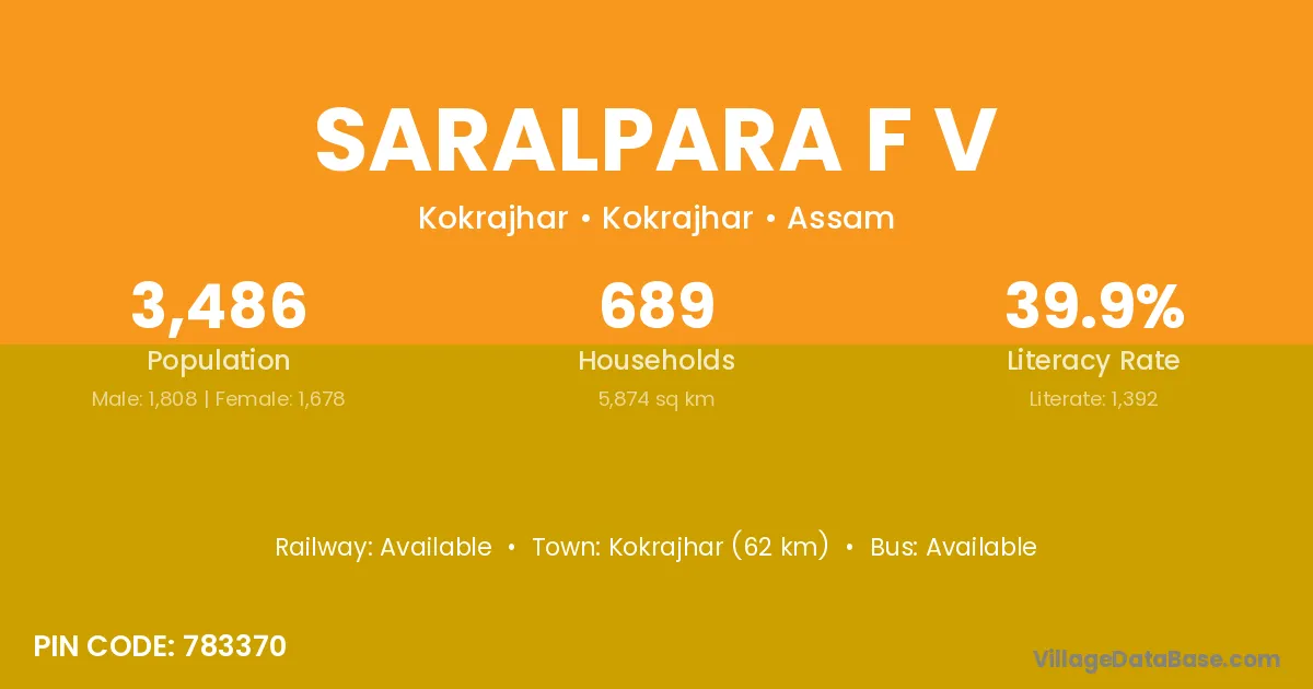 Kokrajhar (62 km) is the nearest town to Saralpara F V village for major economic activities and is located approximately 62 km away.